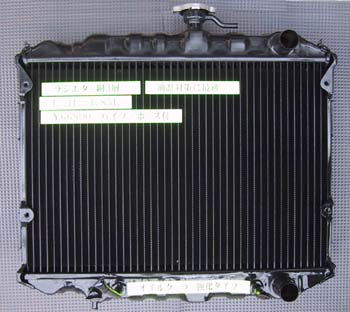 強化ラジエータキット ¥70、200 要ノーマル下取り 銅三層 容量1.85L (純正1.4L) オイルクーラー付き パイプ/ホース付き 左のようなオイルクーラーが ラジエータ下部分に埋め込まれています。